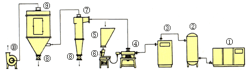 1、空压机 2、储气罐 3、空气冷冻干燥器 4、QS系列气流粉碎机 5、料仓 6、电磁振动加料器 7、旋风捕集器 8、星形回转阀 9、布袋捕集器 10、引风机