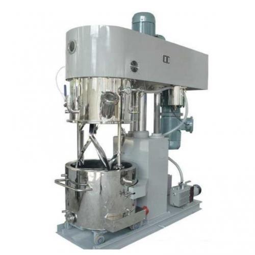 上海鸿善机电设计制造的双行星搅拌机由减速电机、行星架、搅拌器、刮壁器、料桶、液压升降系统、以及机架等构成。行星架转动时,带动箱内的搅拌轴、分散轴(选配)围绕料桶轴线公转的同时高速自转,从而使物料受到强烈的剪切、捏合作用,达到充分分散和混合的目的;在行星架上有一刮壁刀随行星架转动,紧贴桶壁不断的刮拭,桶壁经大型立车精加工后,再经大型自动抛光机抛光,以确保行星架上的活动刮刀在旋转时把桶壁的物料完全刮掉,使桶壁无滞留料,提高混合效果。是一款适用于高粘度物料的设备,该设备由低速搅拌器和高速分散器组成,具有良好的混合、反应、分散、溶解作用,特别适用于固-液、液-液相的分散、混合;由于其极大的输出扭矩,特别适合粘度较大的产品,比如胶黏剂、硅胶、锂电池浆料等;同时设备带刮壁刮底功能,无死角,无残留。