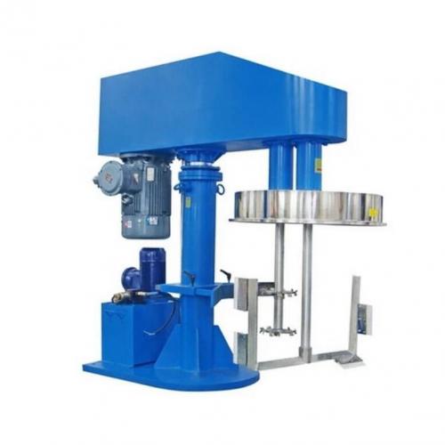 液压升降双轴搅拌机集高速分散和低速强力搅拌于一体,对中高粘度及触变性物料具有很好的适应性。适用于高粘度涂料,油墨,胶黏剂,腻子,原子灰,真石漆等化工产品的搅拌混合。其结构为:低速运转的蝶形搅拌器使物料在缸内翻动和混合,高速运转的齿型分散盘与混合的物料产生强烈的剪切,使聚集物迅速达到混合、分散、溶解的要求。在其高低速的不同作用下,使物料能够达到均匀的混合的分散。