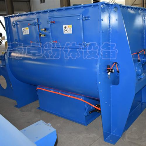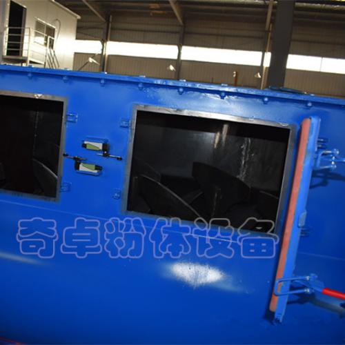 工作原理;本机为卧式机体,筒盖部件装有喷雾、加液装置,筒体成W型,内装有双轴带有浆叶的转子,旋转方向相反,浆叶成一定角度,带动物料旋转,瞬间失重,两侧的物料即反向旋转,相互落入对方区域内,物料来回渗混,中央部位形成一个流态化的失重区和旋转涡流,并沿轴向径向运动,从而形成全方位复合循环,迅速达到均匀,喷嘴可雾化喷入液体,固体与液体混合,混合后由底部出料。