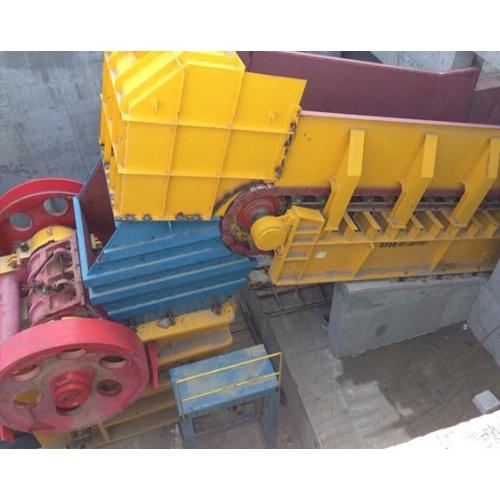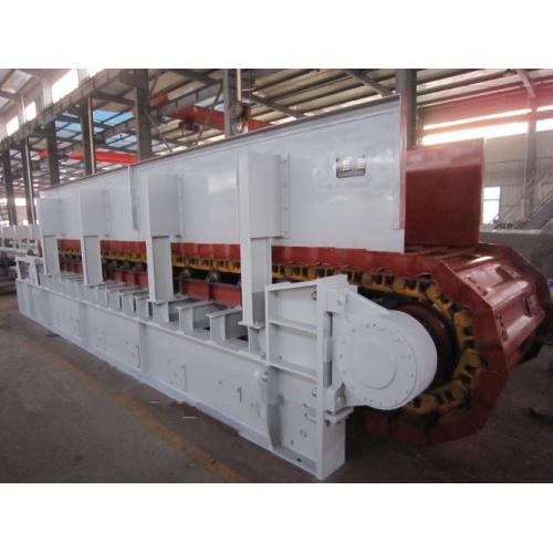 (2)中型板式喂料机一般用于输送颗粒直径在300mm以下,输送产量一般小于300t/h,中型板式喂料机槽板宽度在1000-1500之间,槽板厚度在10-14mm,输送链条节距为250mm的板式链条,中型板喂机能承受较小的料仓压力。但不允许大块物料直接砸在输送槽板上,防止槽板变形,同轻型板式喂料机一样,中型板喂机不允许输送含水分大的粘性物料。