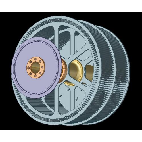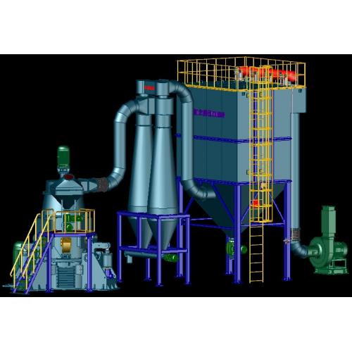 进入磨膛,随着磨盘的转动,物料在离心的作用下,向磨盘边缘移动,经过磨盘上的环形槽时受到磨辊的碾压而粉碎,粉碎后的物料在磨盘边缘被风环高速带起,大颗粒直接落到磨盘上重新粉磨,气流中的物料经过上部分离器时,在旋转转子的作用下,粗粉从锥斗落到磨盘重新粉碎,合细粉随着负压气流带动通过旋风分离收集器收集合格产品,通过分离器转速及角度可达到不同规格的产品粒度。