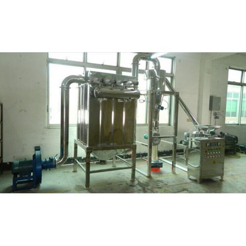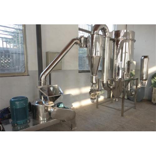 各型号超微粉碎机组都含主机、可调速的螺旋送料器、旋风收集器加气锤震荡装置、袋式除尘箱加气流脉冲装置、引风电机造成负压。大功率引风电机不但可使输送管道形成负压,使达到要求的细粉自动被风力吸入管道,而且巨大的风量还带走了粉碎腔内不断产生的热量,同时对粉碎机组的管道起到一个强有力的清理效果。旋风收集器出料口加装了关风机,出粉口无粉尘飞扬,达到了清洁、环保、节约的效果。