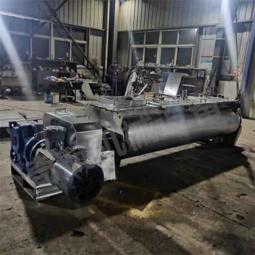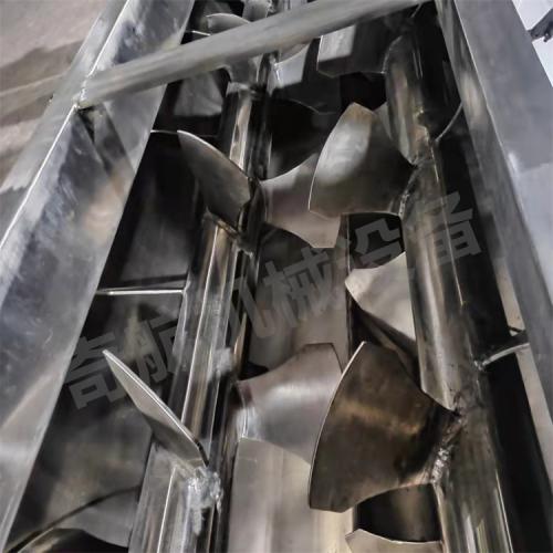 卧式无重力 W形混合容器和反向旋转的搅拌桨叶:两根反向旋转的搅拌轴,带动特定角度的桨叶旋转,桨叶转动可抵达两个搅拌系统圆筒的整个底部,将所有物料加入混合中间形成一个无重力区:桨叶提升物料到几乎无重力的状态,使它们可以忽略颗粒的大小和密度而只有随意移动。