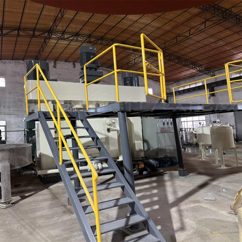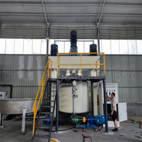 5000L硅酮胶搅拌机:.强力分散机有三个电机、三个搅拌器,各搅拌器按照各自不同的速度进行自转或者公转。变频调速、运行平稳、操作简单极易上手操作。这种混合机可以与各种生产形式同时进行,单速、双速、变速、三种速度可供选择,满足各种工艺要求。强力分散机釜内有三种不同形式的搅拌器,其中一个搅拌器慢速刮壁旋转,其余两面搅拌装置又以不同的转速绕自身轴线高速运转,使物料在釜内作复杂的运动,受到强烈的剪切和搓合。设备内山形刮壁刀绕釜体轴线转动,将粘在壁上和底部的原料刮出参与混合,使其效果更为理想。设备密封性好,可抽真空,具有良好的排气除泡效果。设备釜盖可液压升降。釜体固定,配有自动上料(液体粉体也可人工投料)、出料装置,操作十分方便。