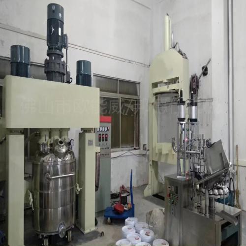 BQF-1100L强力分散机整体龙门重载式结构,三个马达传输动力,混合装置是两组长短轴高速分散,底层装分散盘,上装蝴蝶桨,将物料向下推,使物料得以迅速破碎分散、剪切及混合。一组“山”字型桨叶,带两刮壁刮底,可将底部物料向上翻,将缸壁边缘物料向中间推,确保搅拌分散搅拌均匀。两组高速分散带动物料自身发热到130摄氏度,抽真空脱水分,整个过程约2~3个小时左右。配套压料机根据电子胶稀稠度配备使用。出料系统:高粘度出料泵+出料管道。真空系统:真空泵+真空缓冲罐+真空管道。调温装置:冷水机+管道,模温机+管道。电子胶分装机:半自动硬支分装机,全自动硬支分装机,全自动牙膏管分装机。