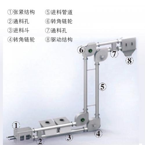工作原理 管链输送杋又叫管链机、管式输送杋、链管输送杋,是输送粉状、小颗粒状及小块状等散状物料的连续输送的理想设备,可以水平、倾斜和垂直组合输送。在密闭管道内,以链片为传动构件带动物料管道运动。当水平输送时,物料颗粒受到链片在运动方向的推力。当料层间的内摩擦力大于物料与管壁的外摩擦力时,物料就随链片向前运动,形成稳定的料流;当垂直输送时,管内物料颗粒受链片向上推力,因为下部给料阻止上部物料下滑,产生了横向侧压力,所以增强了物料的内摩擦力,当物料间的内摩擦力大于物料与管內壁外摩擦力及物料自重时,物料就随链片向上输送,形成连续料流。